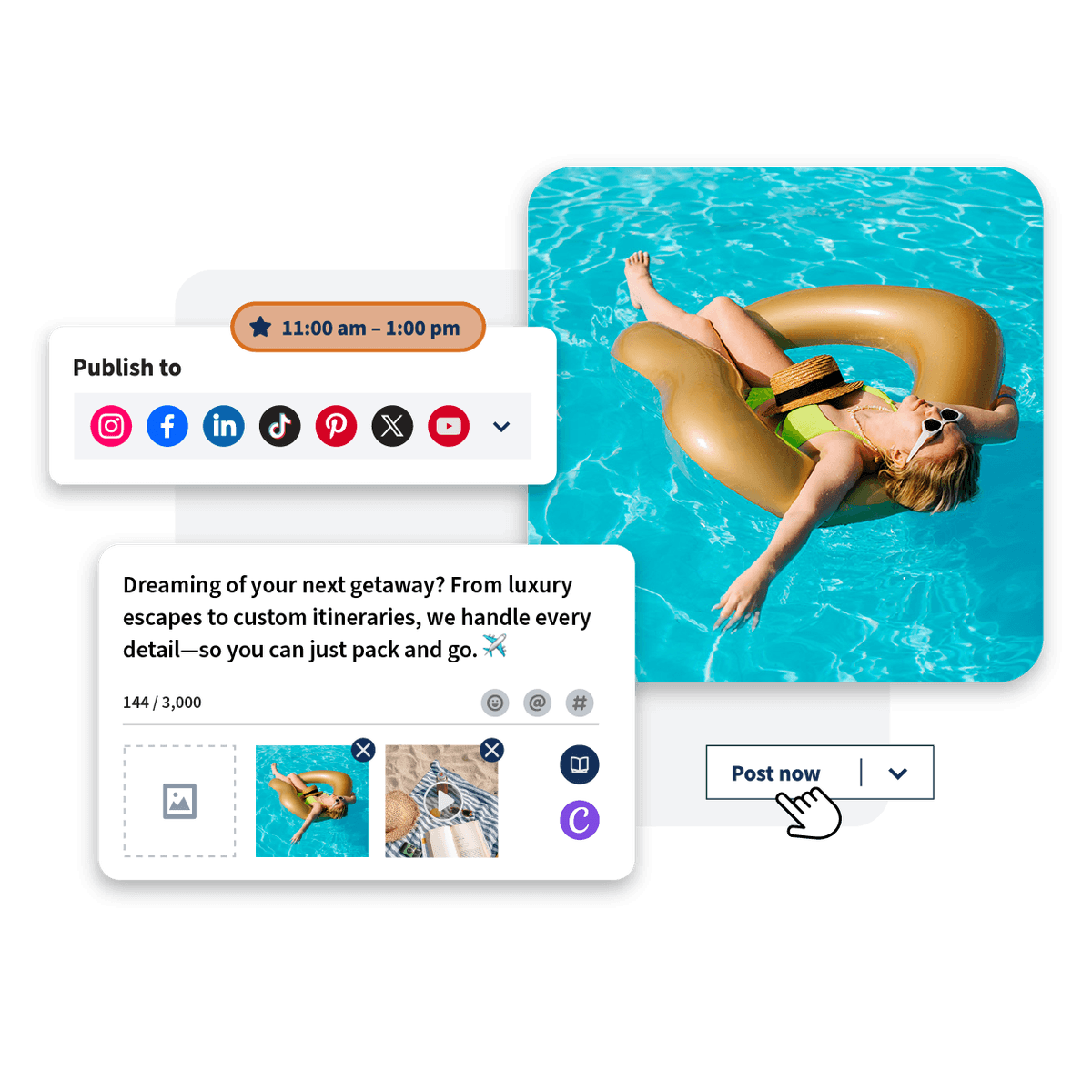 Have AI write your social media captions and hashtags, repurpose top-performing posts, and generate content ideas from scratch.