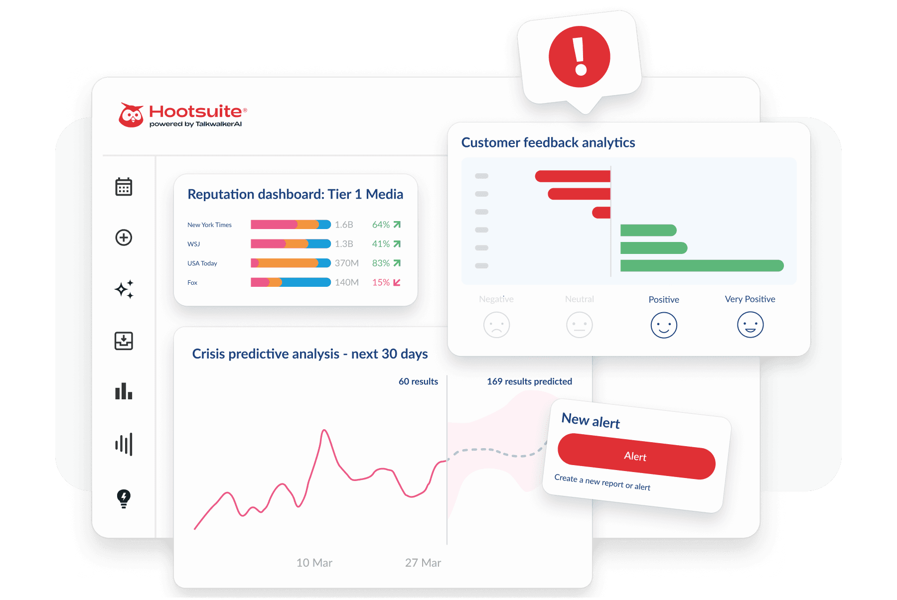Corporate reputation management is the practice of monitoring and influencing how the public, customers, investors, and employees perceive your brand. Hootsuite powered by Talkwalker AI helps by providing real-time media monitoring, sentiment analysis, and issue detection across all channels — so you can protect your corporate image and respond quickly to emerging risks.