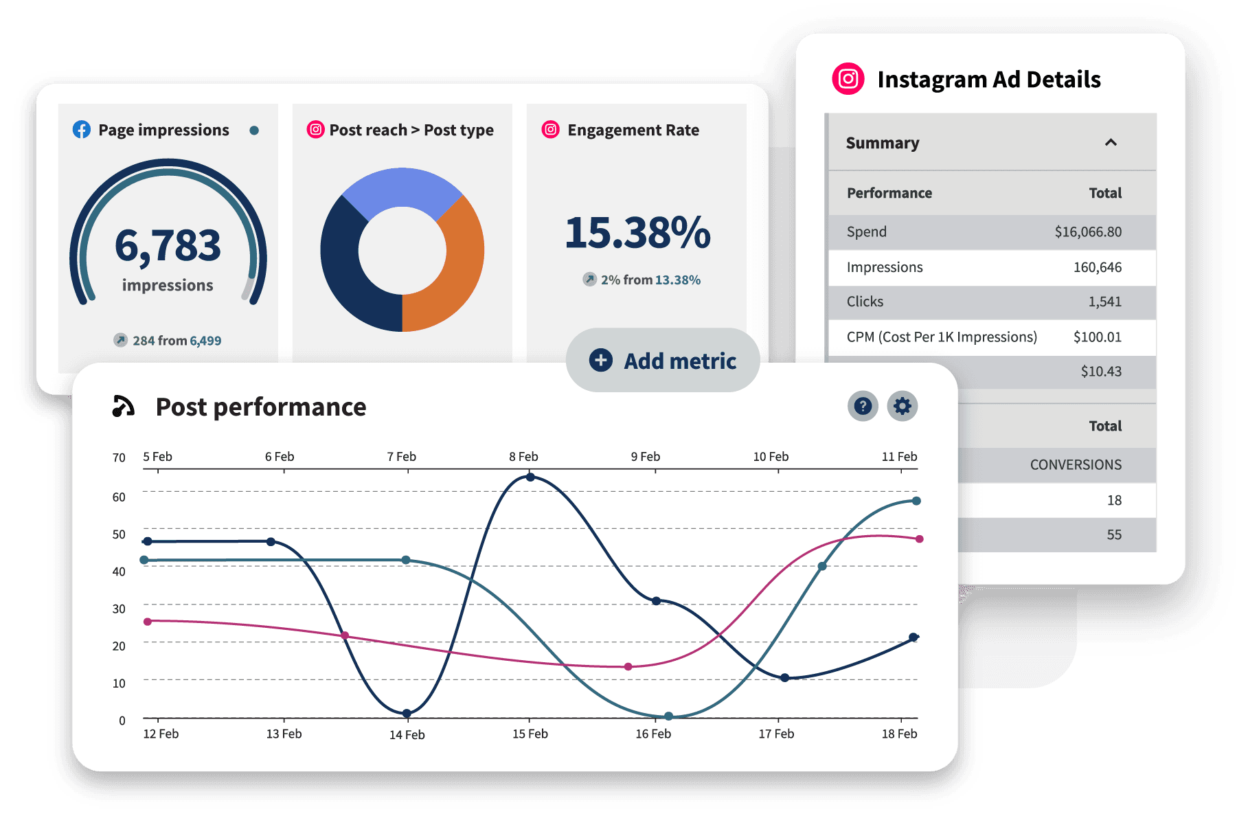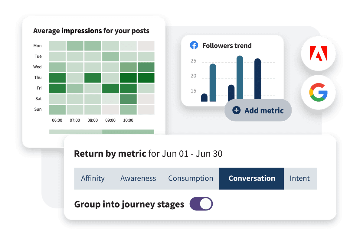 Connect your Google Analytics and Adobe Analytics accounts to see which organic posts, ads, and pages drive the most website traffic or customer conversions. Track performance from impressions to engagements to dollar signs.